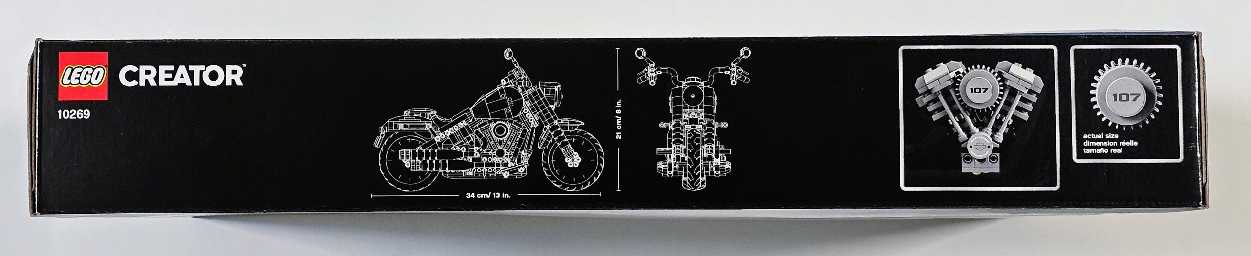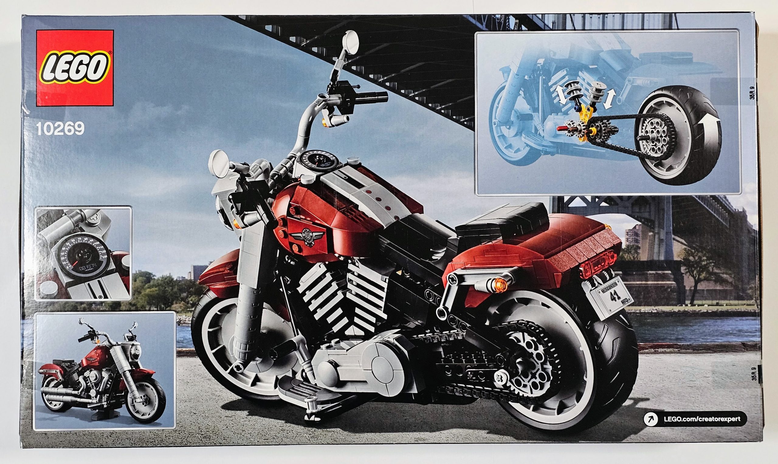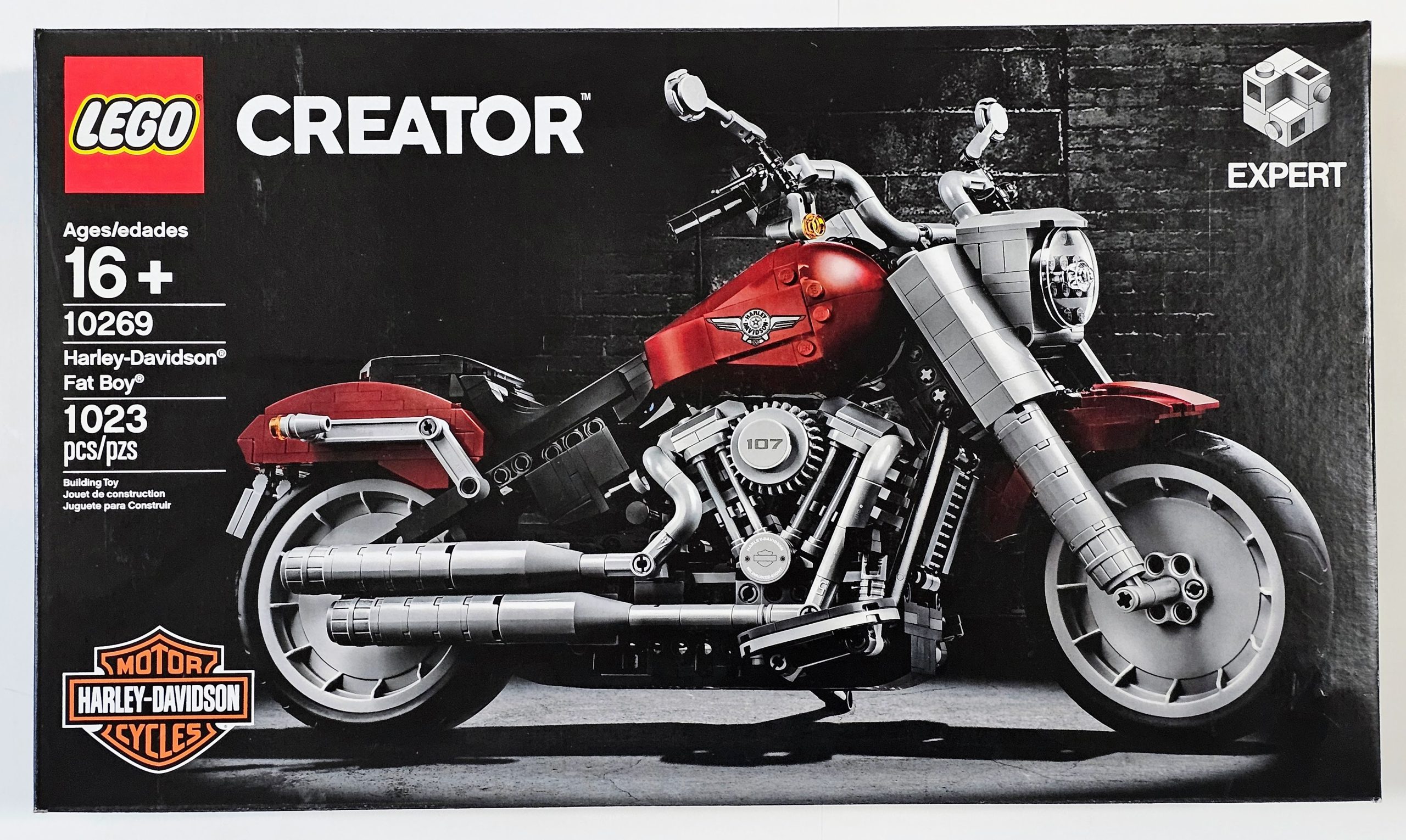 Explore the finer details of iconic engineering with the LEGO® Creator Expert 10269 Harley-Davidson® Fat Boy® motorcycle. Developed in partnership with Harley-Davidson, this highly detailed LEGO motorcycle captures the magic of the real-life machine, from its solid-disc Lakester wheels with beefy tires to its teardrop fuel tank with printed logos and inbuilt speedometer. Other features include a Milwaukee-Eight® engine with moving pistons, dual exhaust pipes, handlebar steering, moveable gearshift pedal and brake levers, kickstand and a sturdy display stand. Finished with a dark red and black color scheme, this amazing display model makes a truly iconic centerpiece for the home or office. This advanced LEGO set provides an immersive and rewarding building experience.