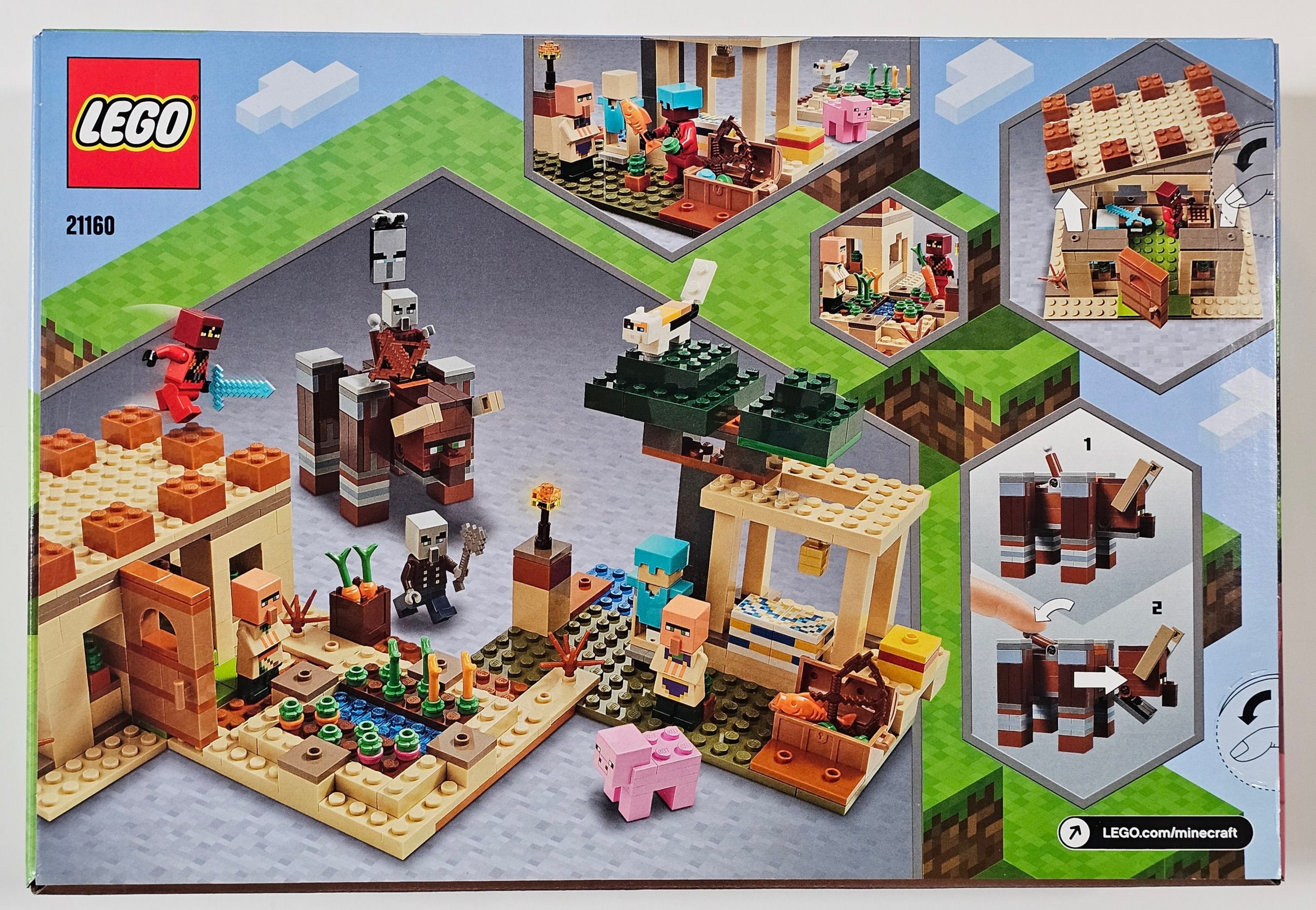 Action-packed, LEGO® Minecraft™ adventure with inspiring environments, cool accessories and favorite characters from the popular computer game. Anything can happen when the mysterious Minecraft Kai figure arrives to fight off the hostile invaders!Many ways for kids to build, play and create!With 3 Minecraft locations – a flat-roof desert house, trading post and a field with crops – players rearrange the set to create endless role-play scenarios. The fun continues indoors by detaching the house roof. As well as friendly Villagers, new-for-January-2020 Illagers, Vindicator and a range of animals and accessories, there’s an awesome, biting Ravager to contend with! It’s big enough for a Minecraft figure to ride on and has jaws that open and snap shut!Bring Minecraft action to life with LEGO bricks and figures!LEGO Minecraft playsets put open-ended independent and group play in kids’ hands. And, with the new-for-January-2020 buildable Minecraft figures, they’ll never want to put it down!